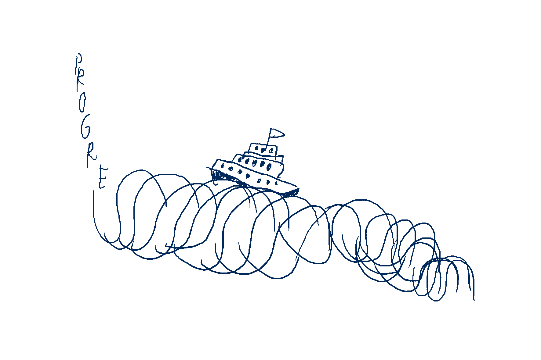 Kujutage ette kruiisilaeva, kus on basseinid, kasiinod, restoranid, saksa pensionärid ja veel palju asju. See on üks neist vägevatest merel hõljuvatest ujuvlinnadest nimega Harmony of the Seas või midagi sellist. Tekil vaatavad kõik järgmise vahesadama poole, pilgud naelutatud horisondile. Teised poodlevad, söövad, roojavad. Sitt voolab muidugi merre, laeva voolusängis käib korralik möll. Keegi ei tea aga, et sinna möllu keskmesse on kukkunud üks reisija. See reisija oli laeval olnud päris pikka aega, ometi mitte kauem kui teised reisijad, ning ta ei mäletanud enam isegi, miks ta seal oli või mida ta sealt tahtis, seega pööras ta pilgu tagasi, otsides lähtesadamat, mingit märki sellest, kust see sõit pihta oli hakanud, kasvõi täpikest kuskil kaugel silmapiiril. Kõik, mida ta silm suutis haarata, oli laeva ahtris kohiseva kiiluvee metsik torm – lained, mis üksteist neelasid, hoovused, mille kokkupõrked moodustasid midagi, mida ta parema sõna puudumisel nimetas plahvatusteks, voolud, mille lihetest tekkinud seismiline energia imes kõik tumeda pinna alla, et see siis uuesti välja sülitada. See oli lummav, isegi kaasahaarav, ja transist üles ärgates on ta ise kõige selle keskel. Kiiluvesi kisub teda vastupandamatu jõuga laeva järel kaasa, nii et teeb, mis ta teeb, ei suuda ta end selle voolust vabastada. Laev aga jätkab sõitmist, inimesed roojavad, tsentrifugaalne pasarahe aina kasvab ja ta suudab end vaevu pinnal hoida. Selle laeva nimi on Progress.