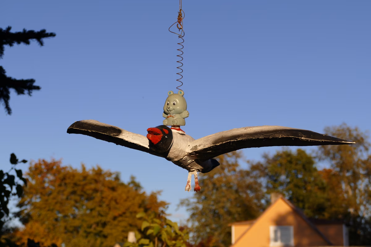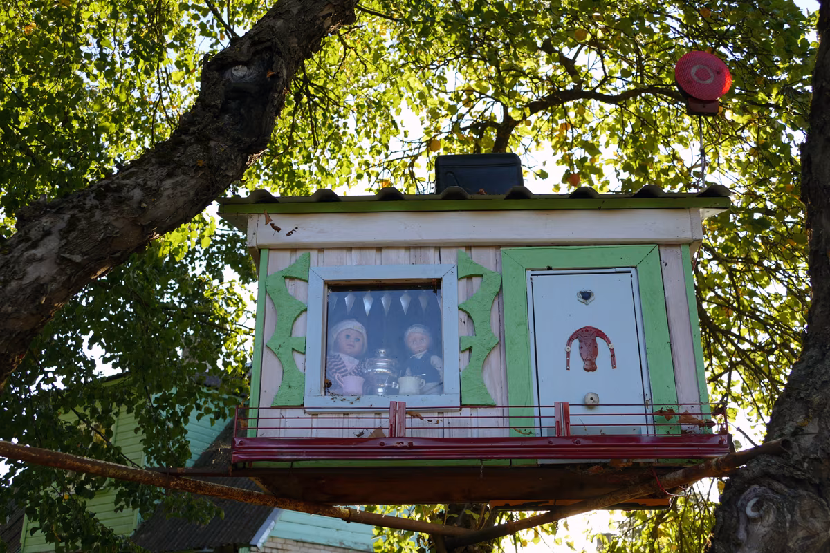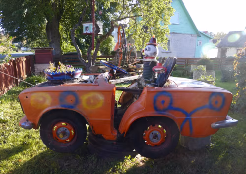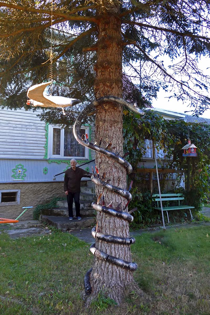 Juba Olegi kodu ümbrus on fantastiline. Võib vist öelda, et psühhotroopiline. Kuuse ümber on end rulli keeranud mustast plasttorust boamadu, kellele – kui meistril tervist jagub – lisandub järgmisel aastal üleelusuurune apteegipeeker. Aianurgas kasvava puu otsa löödud nukumajas tsäitavad (joovad teed – toim.) miniatuurse samovariga vanaema ja vanaisa. Kuuse alla on aga pargitud katkine auto, mida juhib Wilsonit meenutav jalgpallist peaga figuur. Pallipeaga koos sõitsid ka seitse puidust kurge, kes on nüüd juba talihooajaks kuuri varjule toimetatud.