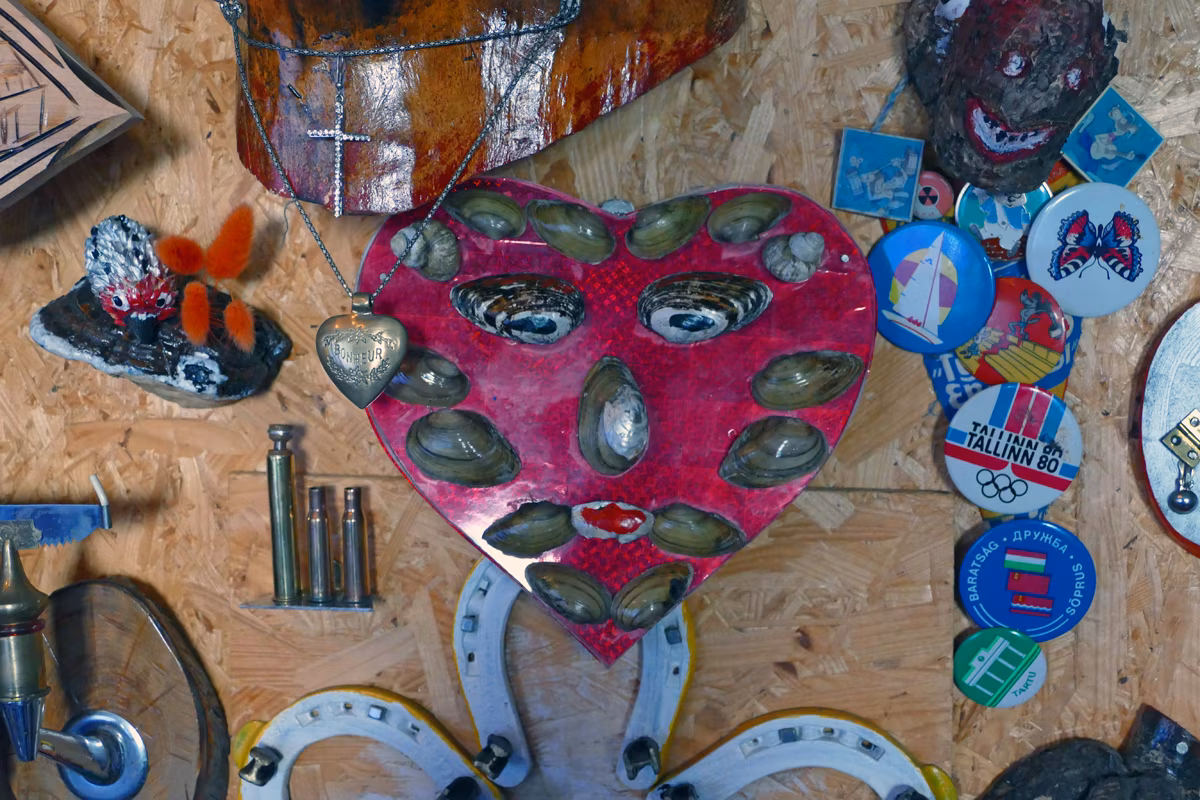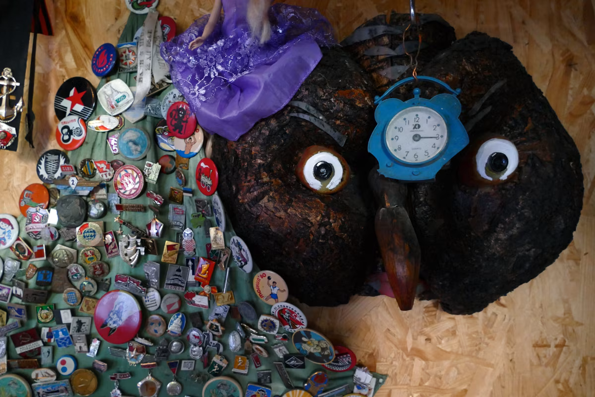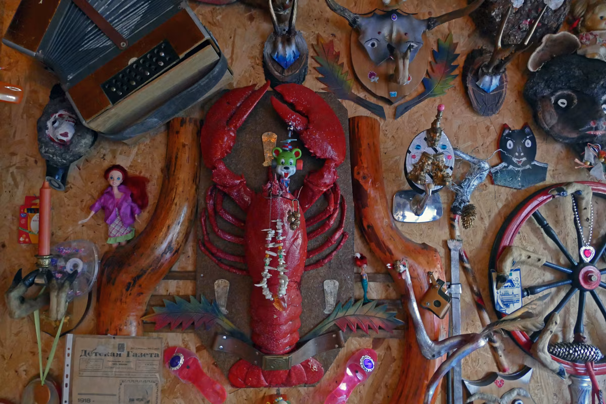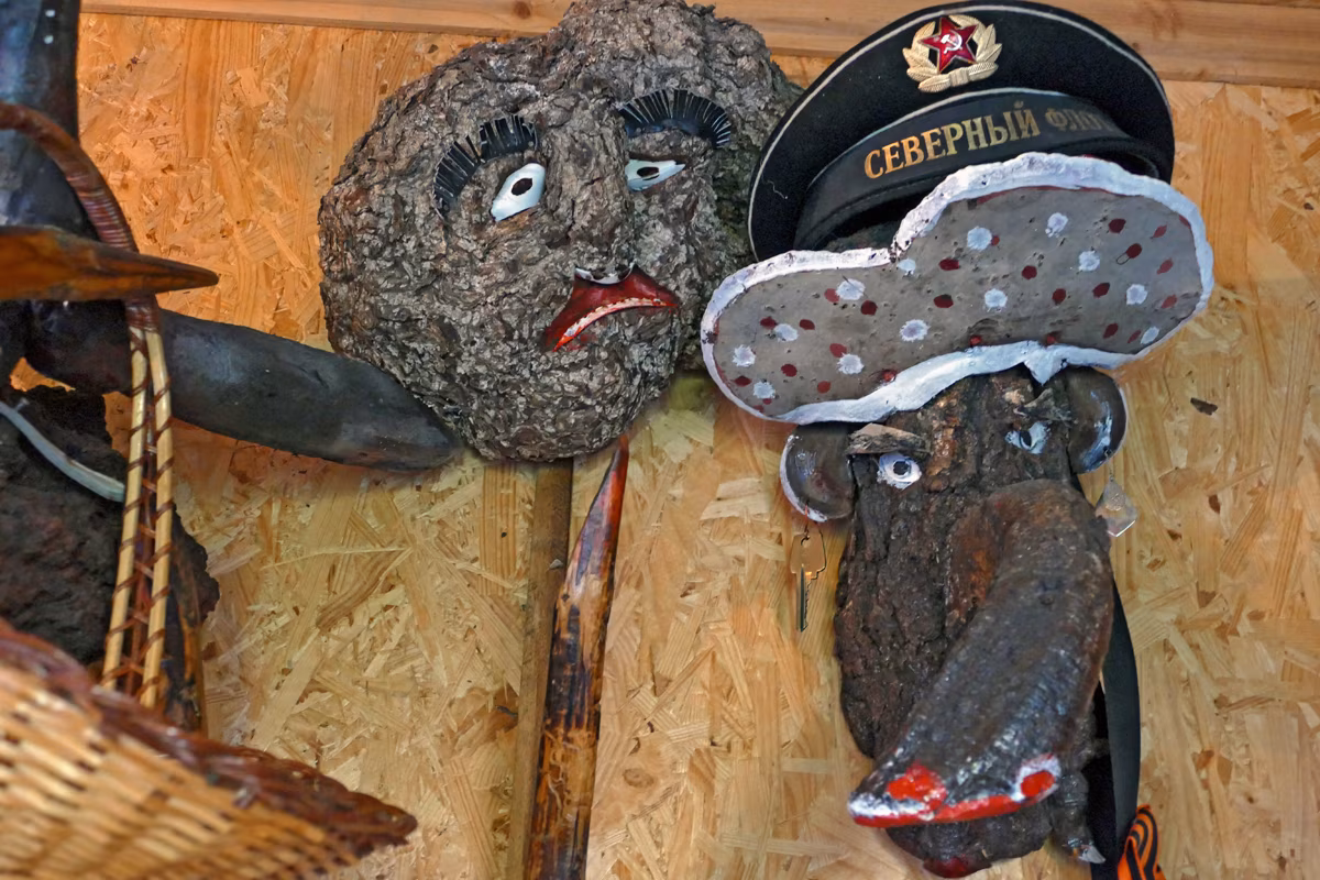 „Ärge nüüd ehmuge,” hoiatab Oleg kuuri ust paotades. Umbes paariruutmeetrine tuba on maast laeni maske, skulptuure ja installatsioone täis.