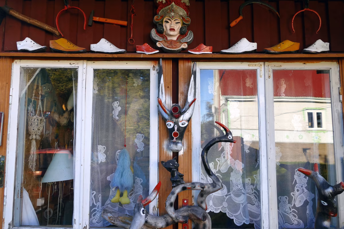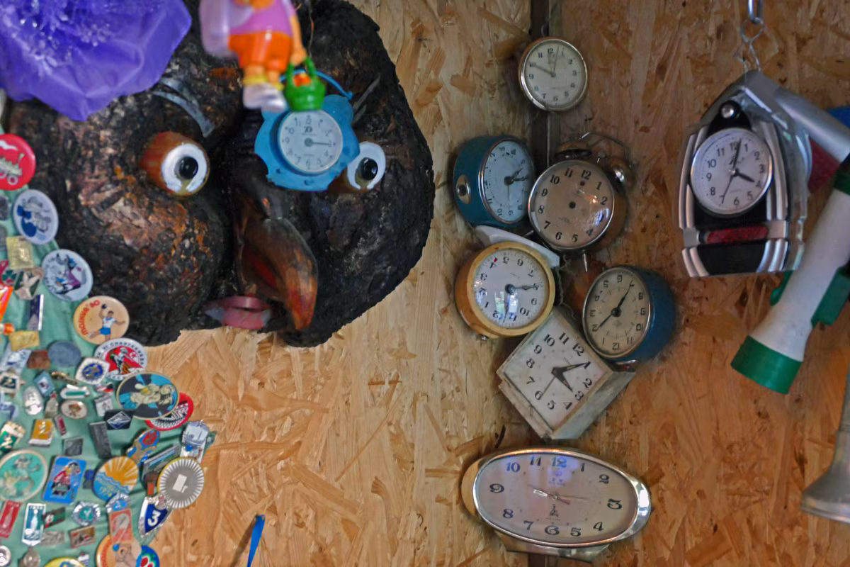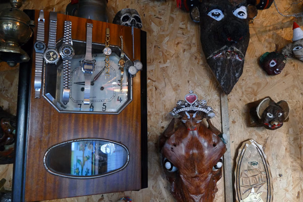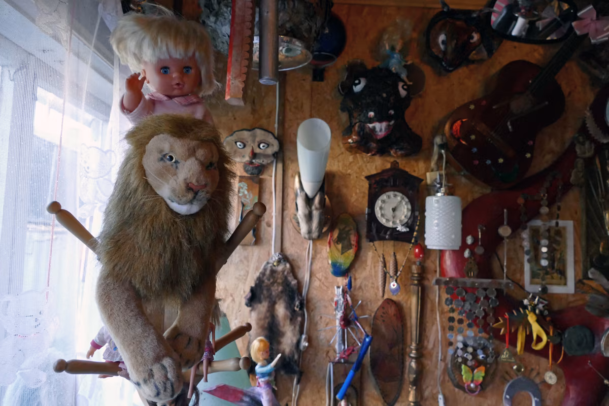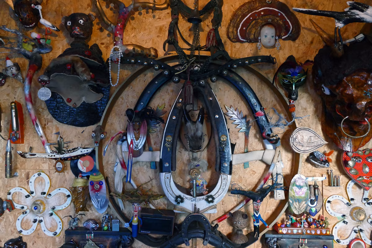 „Ärge nüüd ehmuge,” hoiatab Oleg kuuri ust paotades. Umbes paariruutmeetrine tuba on maast laeni maske, skulptuure ja installatsioone täis.