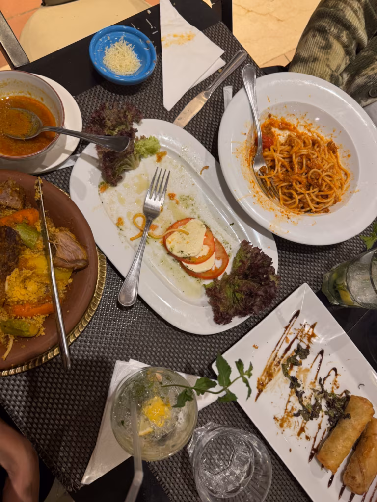 kuidagi saime mõlemad end jälle riidesse, taksosse ja sealt edasi Medinasse. kõndisime mööda öist Marrakechi tänavat sööma (üü, romantiline) mingisse totaalsesse turistipessa, kus pakuti Itaalia toitu Euroopa hindadega. kuigi ümberringi istusid lääne turistid, on Marokos füüsiline intiimsus avalikus ruumis tabu. olime siiski magamistoas toimuvast üles köetud ning restoran tundus mõlema jaoks nagu vangla. tahaks tatti panna ja käperdada, aga selle asemel pidime üksteise silmavärvi kiitma ja tutvuma ilma suudlusteta. vestlus kiskus veidraks ja ma hakkasin vaikselt sellest ihast toibuma.