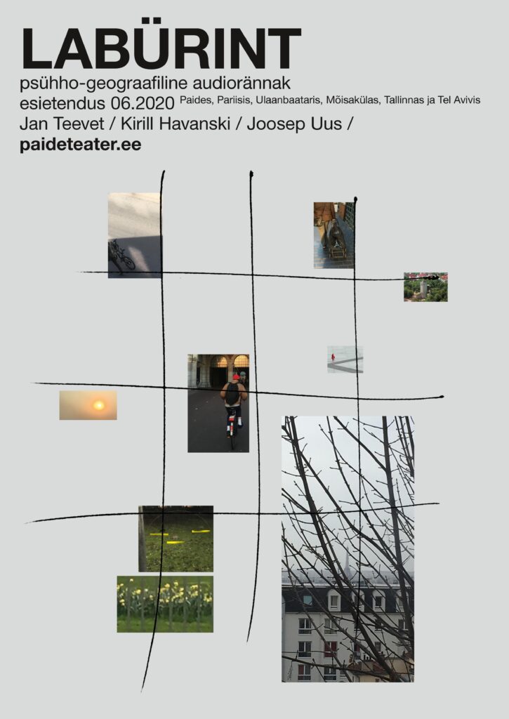 Paide Teatri psühhogeograafiline audiorännak „Labürint”. Idee ja teostus Jan Teevet, Joosep Uus ja Kirill Havanski. Veebis alates juunist 2020 aadressil paideteater.ee/laburint.