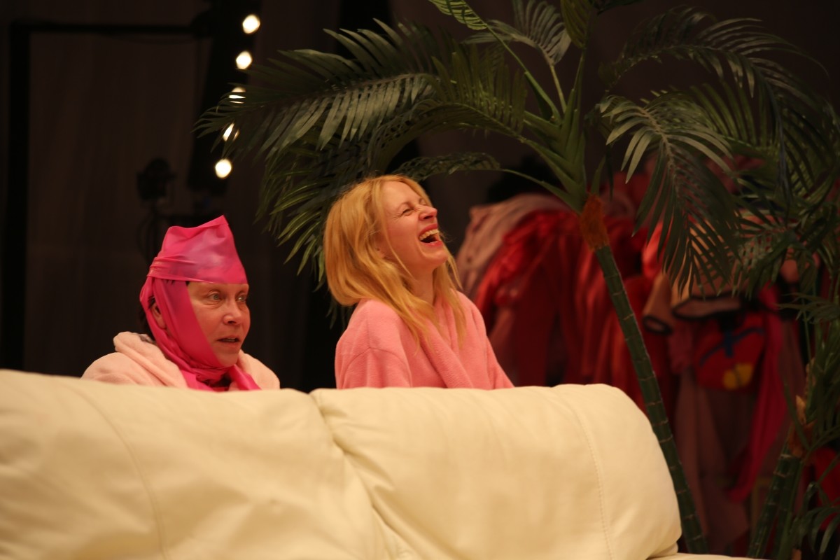 Tagasi konteksti juurde. Nõrkemiseni naeru punnitavate näitlejate tegevus on jõudnud mingisse kontiinumisse, kus tegevusest hakkab kooruma uusi kujundeid. Midagi sümboliseerivad ka Rasmus Kaljujärve kannikad (NO99 kujundite stampkaart). Karakterid trallitavad mööda lava ringi, vahetavad kostüüme ja teevad lava ümbritsevatesse kaameratesse nägusid, mis kuvatakse tagaseina tõstetud videoekraanile. Ühel hetkel näeme eeslaval naljaga pooleks teineteist kägistavaid mehi ning samal ajal ekraanil naise suu ja punase ollusega loodud veritsevat vagiinakujundit. Kui tugevalt silmi kissitada, meenutab roosa pidevalt uusi vorme võttev lavategevus Stanisław Lemi 1961. aasta ulmeromaani „Solaris” ookeani. Seal oli (vist samuti roosa?) ookean maaväline teadvusega keha, millega inimene lõpuks ühemõttelist kontakti ei saavutanudki, ent ookeanist kerkisid muudkui igitähenduslikud kujundid, nt hiiglaslik beebi. Aga kujundid muudkui kerkivad! Kaljujärv ja Jörgen Liik tulevad lõkerdades lavale, mõlemal seljas roosa kampsun kirjaga „Girls unite”. Irvitamine #metoo liikumise üle? Kaks helebeeži diivanit surutakse pikkupidi teineteise vastu ja tegelased hakkavad nende kitsast vahest üksteist käperdades või üksteise eest justkui põgenedes läbi ronima. Väga raske on mitte näha visuaalset vihjet Malaisia külmkapile. Eva Koldits paneb selga superkangelase kostüümi ja läheb lavakaaslastele kallale. Tiit Ojasoo?