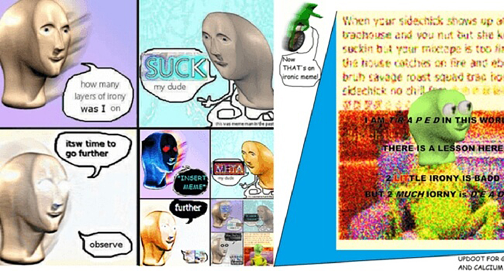 MLG ja vaporwave’i aegne prominentne iroonia asendus vaikselt post-irooniaga. Irooniliste ja tõsiste meemide eristamine muutus üha keerulisemaks. Näiteks hakati nüüd kasutama sihilikult uues ja kentsakalt iroonilises (või hoopiski mitte?) võtmes vanu ja halbu meeme. Sellest ka termin „post-iroonia”, millele on omane krüptilisus ja mäng meemide metatasandiga. Mõned meemiteadlased arvavad, et post-iroonia asendus lausa post-post-irooniaga. Mina seda ei usu ja ütlen endiselt „post-iroonia”. Äkki ma olen lihtsalt vanamoeline ega saa lastest aru, pagan seda teab.
