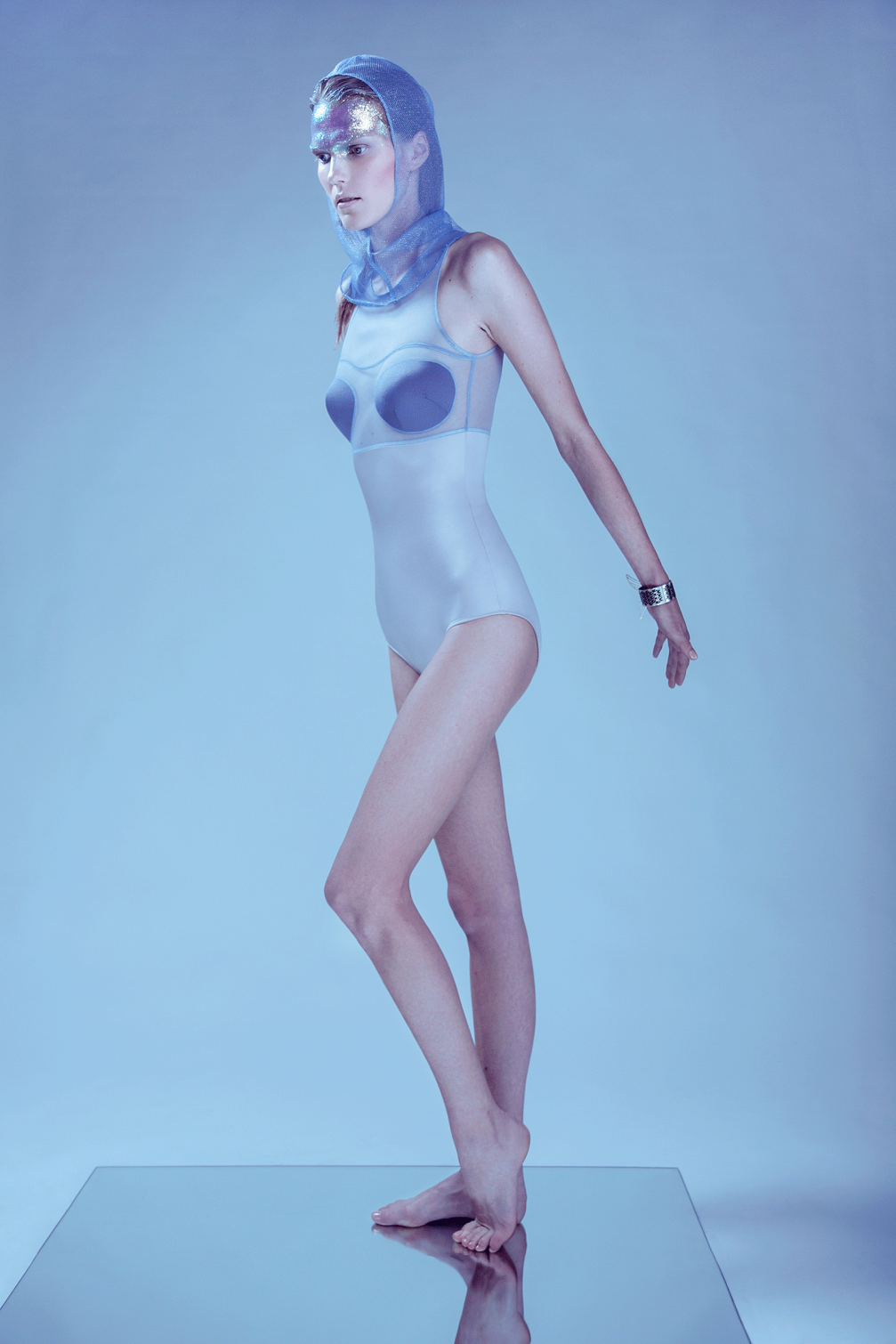 The collection consists of ascetic cut one- and two–piece swimsuits and short tunics, as well as accessories — airy meshes that can be worn as swim caps, as well as on a daily basis to protect hair from sun and wind. One can completely disappear from sight under “Ambush” — a full–body net, created in collaboration with jewellery designer Alise Tālberga who constructed a mechanism for the supporting head umbrella.