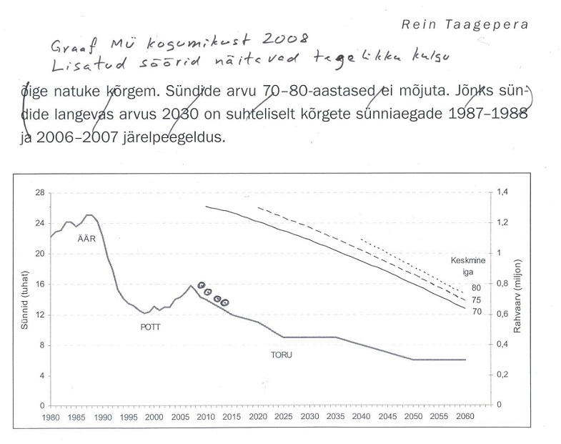 Meie sündide kõveral on klassikalise vetsupoti kuju – seda näitasin graafil Metsaülikooli kogumikus „Eesti jätkusuutlikkus ja lõimumine” (2008, lk. 25). On poti äär, kus 1984. aasta stagnamasenduses sündis ikkagi 24 000 last – ja 1988. aasta laulva revolutsiooni elevuses koguni 25 000. Iseseisvudes vist otsustati, et kuna võõrad meid enam välja ei sureta, peame seda tegema ise. Sündide arv potsatas poti äärelt poti põhja, 12 000 juurde.