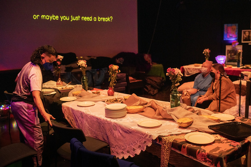 Edukuse tähendus nihkub säärases kontekstis. Kõige keskmesse tõmmati nii iseenda kui ka publiku heaolu, normaliseeriti vajadusi ja sõltuvussuhteid. Esimese päeva viimast osa ette valmistades paluti kõigil lähtuvalt võimalustest osaleda ruumi ümberkujundamises. Asetasime keskele lauad, mille me koos ära kaunistasime ja katsime ning siis tõime köögist kohale toidu. See oli Sal Reis Trouxa ja Ar Utke Ácsi „a guttering”– õhtusöögi-performance, kus lauale asetati lai valik roogasid kõrvitsanuudlitest fermenteeritud sidrunilõikudeni, porruga praetud tempest Trouxa vanaema retsepti järgi valmistatud Portugali riisipudinguni. Käikudele antud nimedest õhkas sarkastilist kapitalismikriitikat, aga sõnad ei olnud tegelikult olulised. Trouxa ja Ács söötsid hooletöö tähenduse kõikidele kohalolnutele sõna otseses mõttes sisse.