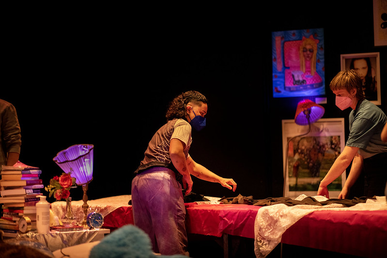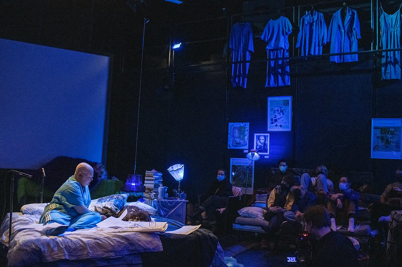 Musta kasti keskele oli toodud suur tekkidega kaetud voodi, selle ühes ääres pehme kaisuhunt, kõrval öökapp lambi ja hunniku suutmissurveteemalise lektüüriga. Isa Hukka, luuletaja ja aktivist, kelle jaoks sai sellest voodist kolmel korral lava, parafraseeris mulle kanada luuletajat ja sant-aktivisti Leah Lakshmi Piepzna-Samarasinhat, öeldes, et voodid on maailmad. Tõepoolest, voodi on crip– ehk sandikunsti[1] üks keskne motiiv. Kui välismaailmas võivad varitseda iga nurga taga ohud, kriitilised pilgud või lihtsalt pidev kehaline ebamugavus, siis voodist saab pelgupaik, restoran, kirjutuslaud ja baar – isiklik ja pehme, püha ja mugav. Tekkide all, patjade peal meel pehmeneb ja aeglustub. Unelemise vormide järgi olid nimetatud ka festivali kolm faasi: alustasime öistest unenägudest, siis liikusime päevase unelemise juurde ja lõpuks suundusime fantaasiatesse.