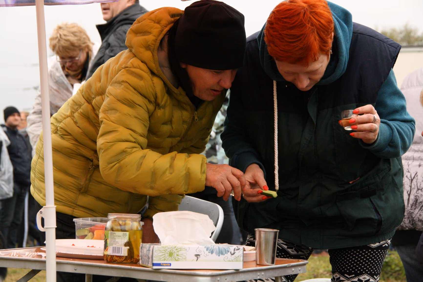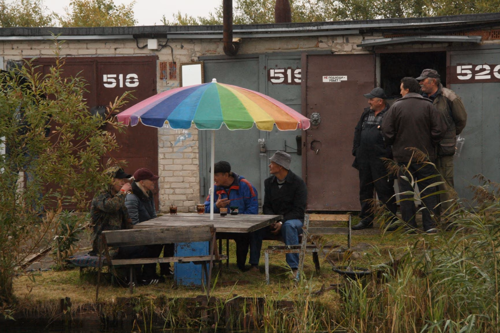 Istume laua taha. Teen kõrval aknaluugi lahti. Näeme jõge ja vastaskallast, kust paistab suur Venemaa, ulatub siit Vladivostokini välja. Ro-Rosse sooja jäänud Colombina saadab Andreile telefonis kassipilte. Andrei võtab oma aurustaja välja. Vihm kasvab jälle valjuks. Inimesed lähevad lõkke juurest tagasi katuse alla. Panen aknaluugi kinni.