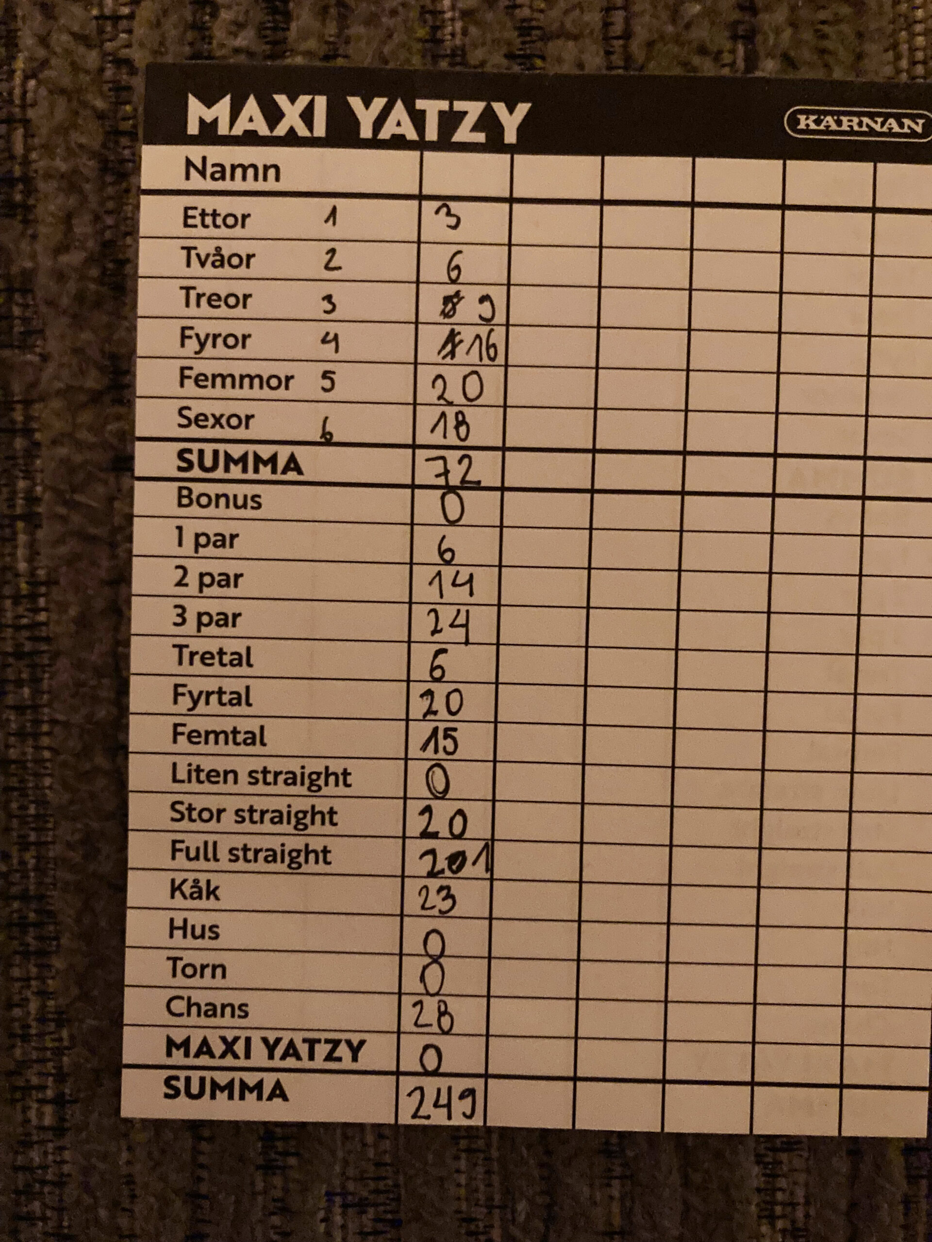 Nagu planeeritud, mängin õhtul Yatzyt. Saan skooriks 249. Väsimuse tõttu teeb mu mõistus akrobaatikat, mida on pea võimatu takistada. Kaks, neli, üheksa… 249? 2:49? 2 + 4 + 9? 15? 1 + 5 = 6? 24.09? 2.49 eurot??? Märkan, et külmkapi peal oleva mikrolaineahju peal valesti seadistatud kell näitab 2:37. Ehk 12 minuti pärast on tablool 2:49! Panen kõik tuled kustu ja istun pimedas, jõllitan numbritablood ja pilgu udunedes tundub, et tabloo sai silmad ja jõllitab mulle vastu. Näita ennast! Näib, et liigne ülemõtlemine on viimas selleni, et looming hakkab loojat ära sööma. Õnneks ei kesta õhtu kunagi igavesti.