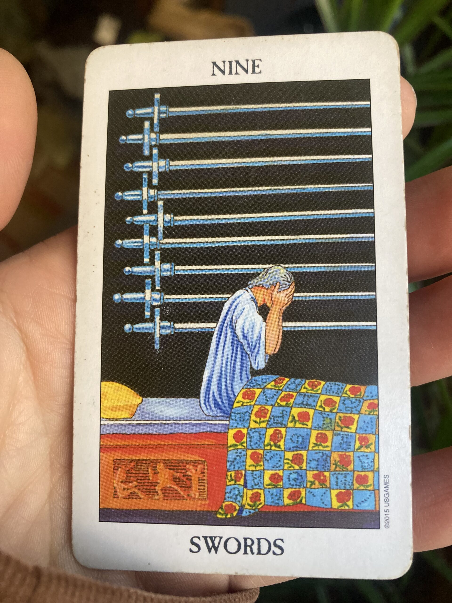 Tunnen teatavat elevust, aga samas veidi kahtlen ka. Tahan rohkem kinnitust! „Mis on selle projekti potentsiaal?” küsin Rider-Waite’i tarokaardipakist kaarti võttes. Saan mõõkade üheksa, mis kujutab meest, kes on kinni jäänud oma kahtlustesse, samas katab ta jalgu kaunis roosiline tekk. Tõlgendan seda järgmiselt: ära kassi, tõsta pea üles ja märka, et su jalgeesine on viljakas! Äkki ma leian sealt poest endale samasuguse roosilise teki?