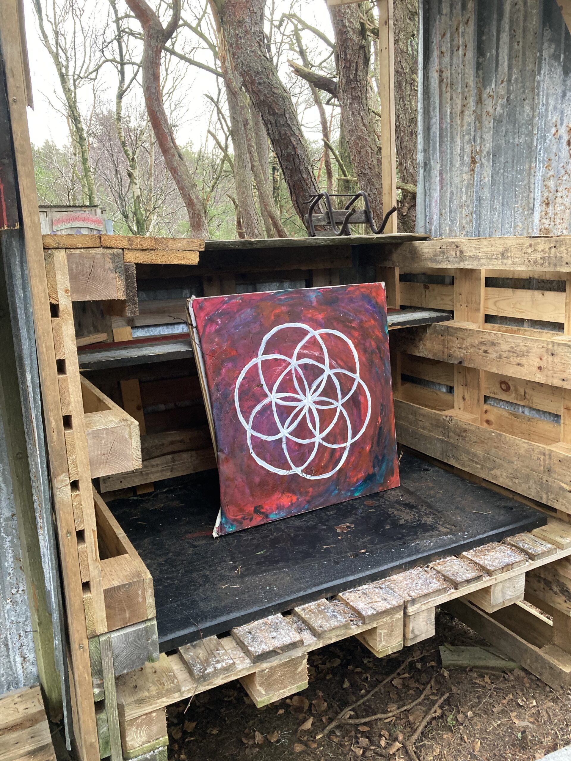 DJ-putka. Vaatan distantsilt, hingan sügavalt sisse ning sammun selle poole. Selle tagant leian tagurpidi lõuendi, sirutan käe, keeran selle ümber. Püha geomeetria! The seed of life… Eluseeme.