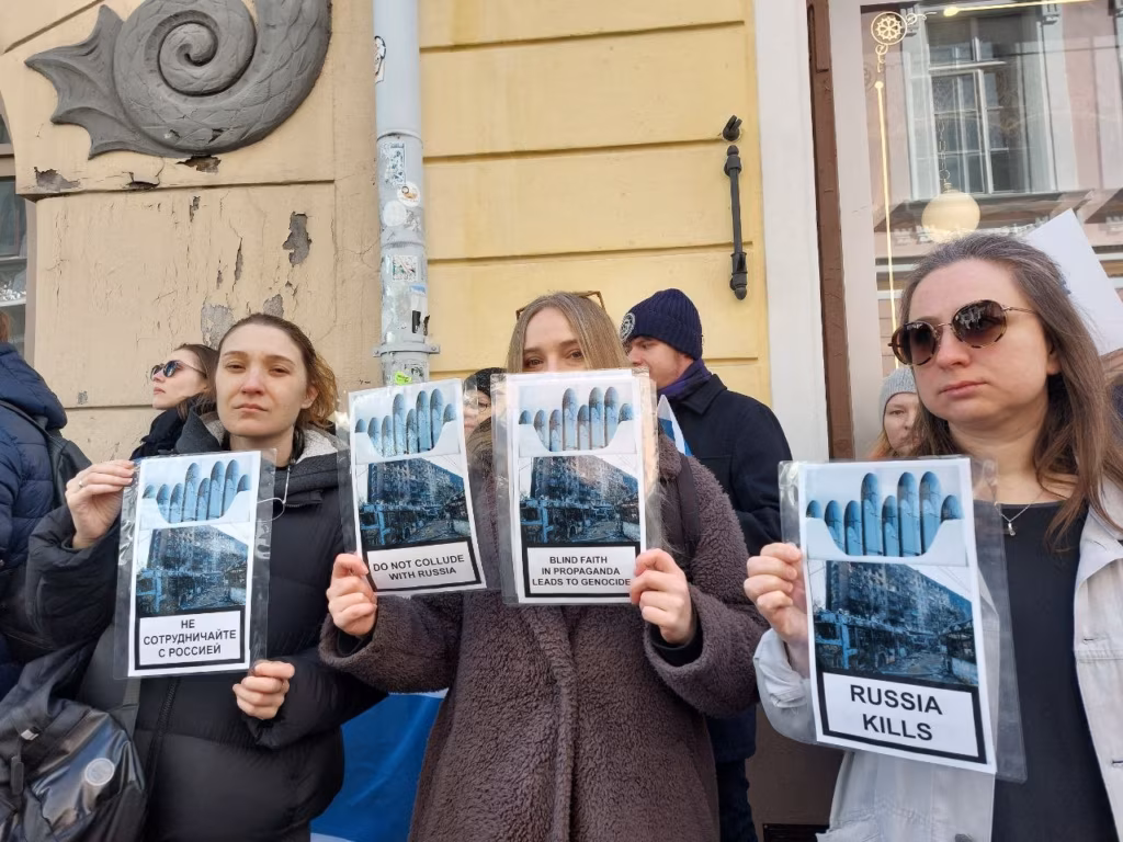 Rahvusvahelise feministliku sõjavastase liikumise FAR protest Venemaa saatkonna ees 08.04.2023. Foto: FAR Tallinn
