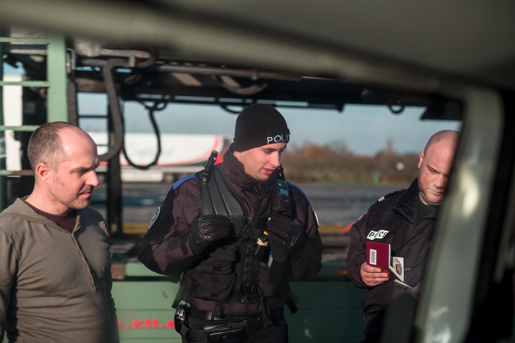 Prantsusmaa piiril, kus novembrikuiste terrorirünnakute tõttu on välja kuulutatud eriolukord, suunasid meie auto teelt kõrvale mundris mehed, relvad õlal. Meie mustade kirjade („Suurim CO2 jalajälg Euroopas on eestlasel!”, „Kliimabuss to Paris COP21” ning hooandjate nimed) ja temperatuuritõusu kriitilist piiri tähistava punase joonega valge mikrobuss tundus piisavalt kahtlane, et seesistujate näod üle vaadata. Andsime piiri turvavatele sõduritele ja politseile oma dokumendid, sh Müürilehe pressikaardid, ning roolis olnud Mihkel vastas rõõmsa jaa-ga sõduri küsimusele, kas oleme patsifistid. Jäime ootele. Relvadega mehed jalutasid meie sõiduki ümber ja tegid telefonikõnesid. Lõpuks otsustati, et tundume ohutud küll ning saime üle piiri.