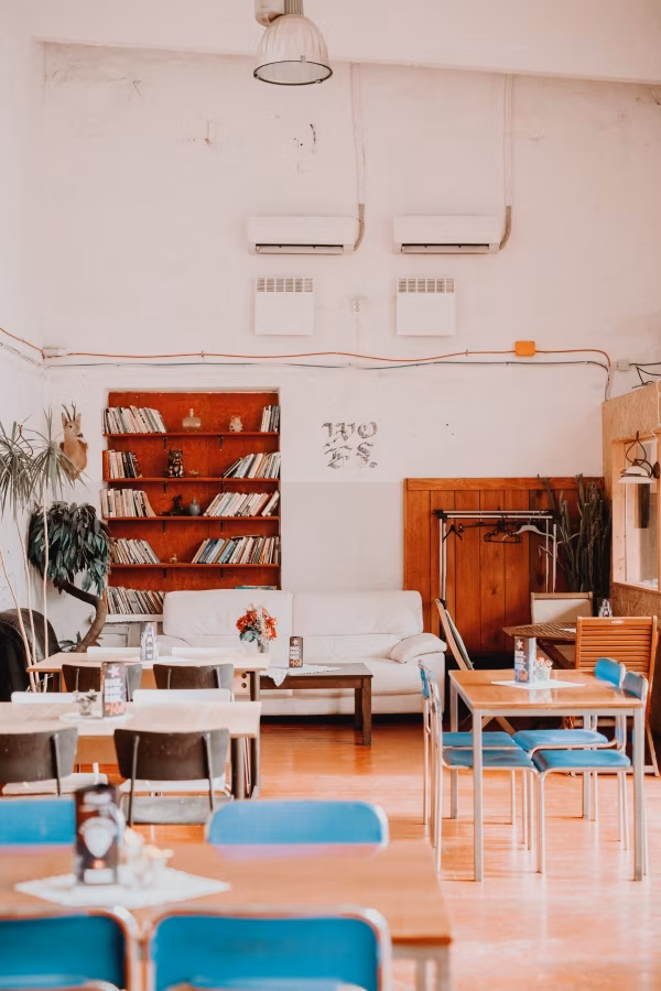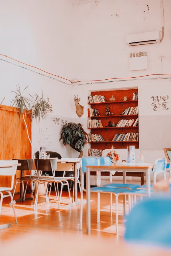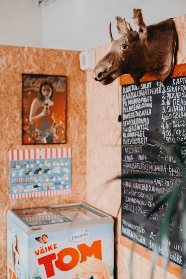 Saali täidab umbes 10–12 90ndate stiilis sööklalauda, ühel neist malelaud. Riiulitel seisavad ja seintel ripuvad topised ning sponsorite (eelkõige õllefirmade) sildid. Näeme tahvlit, kuhu keegi on väga hoolikalt kogu menüü üles kirjutanud. See, kel parajasti söögiisu pole, leiab nurgast diivani, mille kõrval on raamatutega täidetud riiul. Mind näljase inimesena köidab aga sissepääsust vasakule jääv pikk lett, sest selle taga ongi kodustest toitudest pakitsev köök. Kõigile midagi.