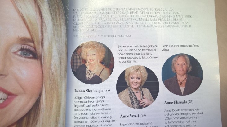 Järgmine mittereklaamtekst tuleb ette 75. leheküljel, kus seitse naist vanuses 57–76 räägivad oma elukogemusest ja tarkusest ilurituaalidest (mis te siis mõtlesite, et millest ühel naisel oleks pädevust rääkida?), millega seoses tekivad kahetised tunded. Ühelt poolt on klantsajakirjad aru saanud, et vanemad naised ei ole maamunalt ära kadunud ja on omal moel neid jõustama hakanud (no tarbijana jaksab küpsem daam ilmselt endale kallimaid kingi osta kui 15-aastane vanemate rahakotist sõltuv tüdruk, seega ei tasu naist veel maha kanda), teisalt on see kõik nii kohutavalt pinnapealne. Selle asemel, et küsida omaaegselt maailmastaarilt tema karjäärivalikute või naisteadlaselt hiljutiste artiklite kohta, küsitakse nende välimuse kohta. No õnneks oskab kogenum naine selle juba näiteks enesehinnangu ja -väärtusega siduda, aga küsiks õige neid küsimusi, mis tegelikult olulised on, ei? Ja artikkel lõppeb ikkagi vanuse varjatud stigmatiseerimisega, mis kinnitab, et vähesed naised ei kuulu pärast mingi kriitilise ea saabumist mahakandmisele ja naise põhiline väärtus on siiski ilu. (Khmm)