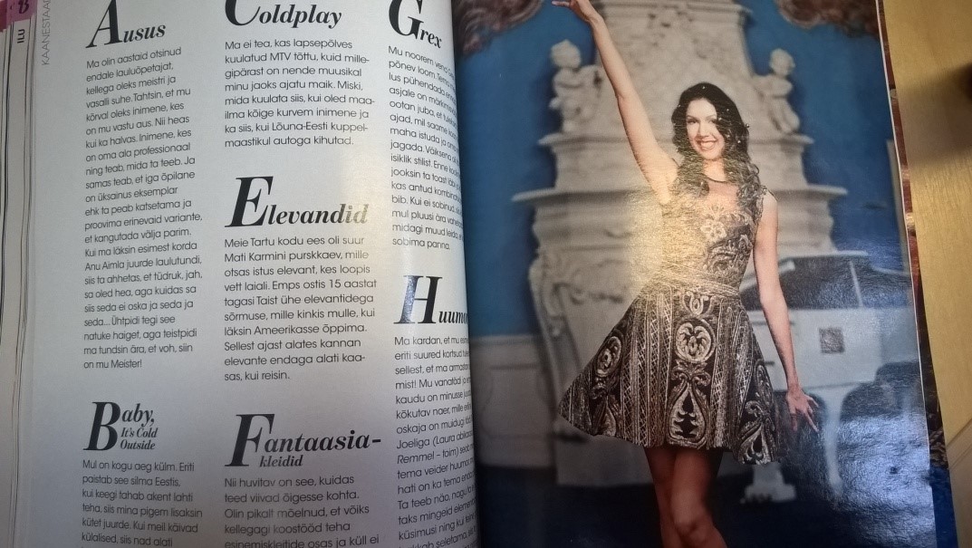 Umbes poole ajakirja peale, lk 124, jõuab kätte ka kaanestaari persoonilugu. Ja mõistagi keskendub see välimusele. Tuleb meelde üks Eesti Laulul kõlanud lapse Twitteri-küsimus „Laura, miks sa kogu aeg nii ilus oled?” – mille peale Laura ja saatejuhid kooris „aww” tegid ja kogu mitteinfantiilne vaatajaskond irratsionaalsest piinlikkusest maa alla vajus. Ühesõnaga – pilti rohkelt, välimust palju ja sisu nadilt. Või on toimetajatöö tegemata, mistõttu lõin lugemisele käega, kui järjepanu keeleliste lapsuste otsa komistasin. Näiteks rääkis Laura, et unistab „meistri ja vasalli suhtest” enda ja õpetaja vahel. Mis asi see on? Järsku ikka meister ja õpipoiss? Või peab ta ennast ülikuks, kes meistrilt teenust tellib? Tähestiku stiilis lühivormi oleks ju saanud toimetada küll. Üldiselt leian, et pealiskaudse vormivalikuga on Laurale liiga tehtud ja tema ainus funktsioon on olla ajakirjaleti dekoratiivtapeet – kui juba kaanele panime, siis sisuga pole vaja tegeleda? Loost poole moodustavad siiski glamuuripildid, mis õpetavad Laura lapsfännidele seda, kuidas kogu aeg „nii ilus” olla.