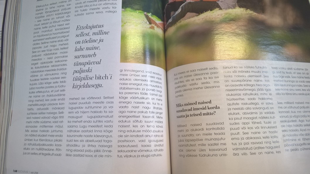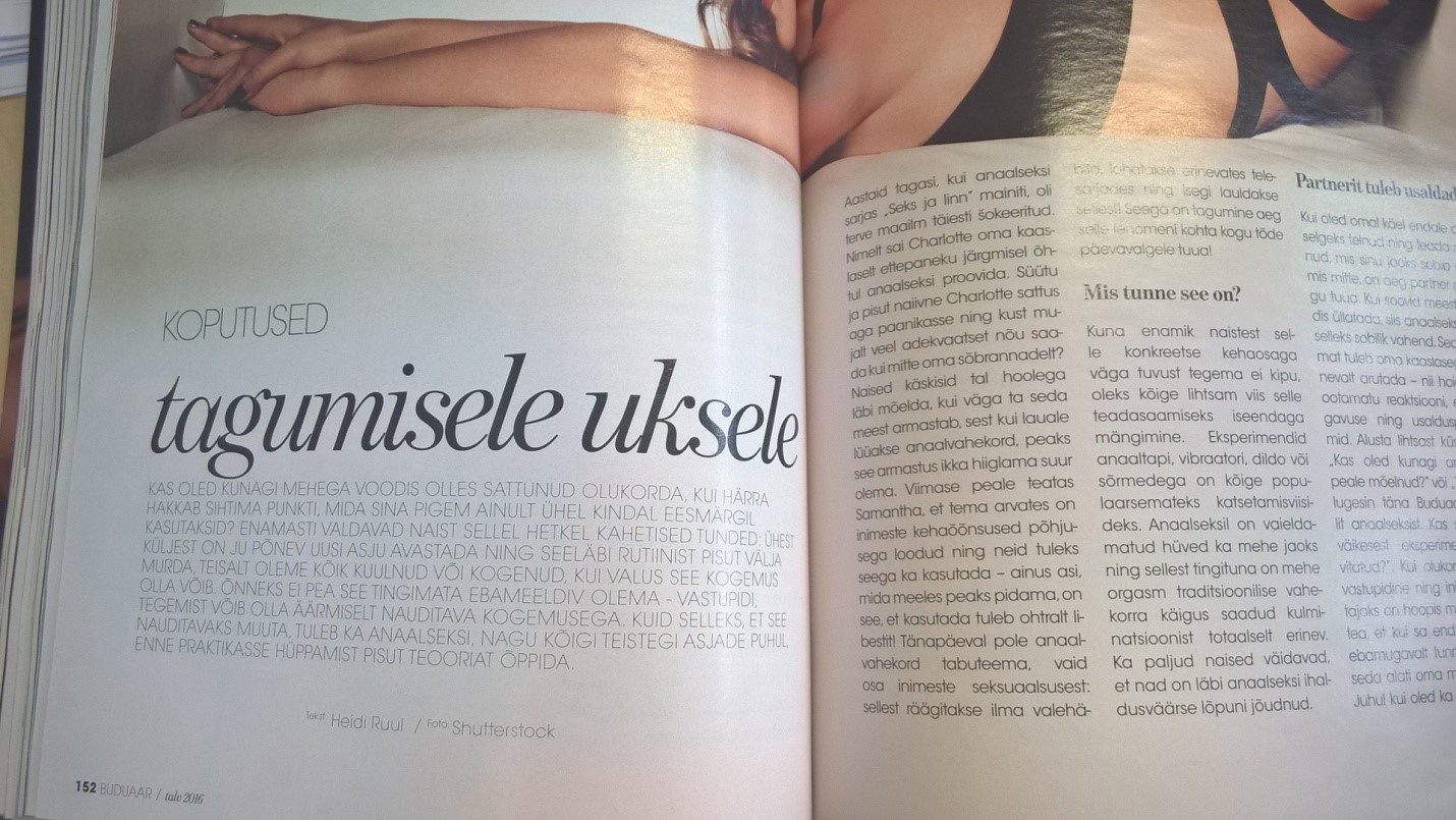 Peenis, vagiina, häbememokad, rinnad, munandid, aanus. Õige, nüüd tuleb seksijutt. Lk 152 – voodielu võib käsitleda küpselt ja avatult, mida naisteajakirjalt oodata võiks, (tegemist on siiski „10 seksinippi ja tee täiusliku orgasmini” žanri leiutanud ajakirjadega) või siis ülimalt lapsikult, mida Buduaar on otsustanud teha. Mul polnud õrna aimugi, kui paljusid erinevaid eufemisme võib kasutada päraku ehk aanuse kohta. Kummaline, et just selles loos kumab läbi seksi tabuks pidav (sex negative) suhtumine, kus räägitakse „tagauksest”, „sellest teisest august”, „punktist, mida üheks teiseks eesmärgiks kasutatakse…” jne. Kogu kirjapandust kõlab läbi „uih ja aih” suhtumine ja mõjub seetõttu üsnagi infantiilselt. Taoline kehatabu on kahjustav, kuna ei võimalda käsitleda inimkeha sellisena nagu see on, tekitab võltshäbi ning asjatuid komplekse. Miks peaks üks inimene oma kehast rääkides ebalev või närviline olema?