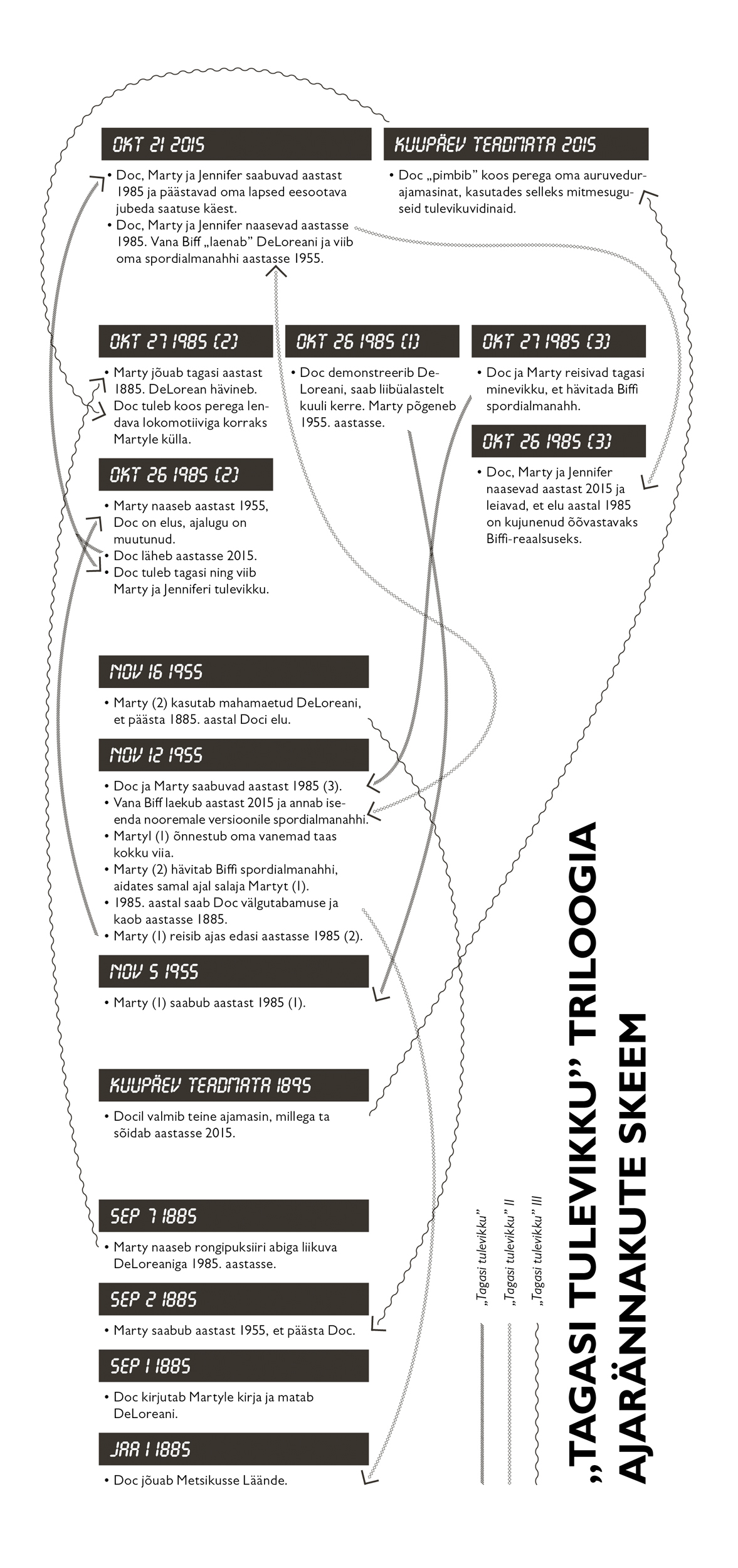 Aga kohe ette keerav kuupäev 21. oktoober 2015 on see fännide kauaoodatud kuupäev, mil Marty, Doc ja Jennifer „tulevikku” laekuvad, et päästa oma lapsed eesootava ohu käest. Fännid on magusas ootusärevuses. Nii ka mina. Maailmas pole muidugi kõik päris nii läinud, nagu avangardlik „Tagasi tulevikku 2” 1989. aastal ennustas. Aga Kubrick pani „Kosmoseodüsseiaga” ka natuke mööda, nii et me ei pane pahaks. Muide, Elektriteater teeb sel märgilisel päeval kogu triloogiale sügava kummarduse ja kutsub Tartusse maratonile. Mul on pilet olemas. Meelde tulevad neljas klass ja hommikud. Makk. Kellade tiksumine. 1,21 gigavatti. Liibüalased. Einstein. „Damn! I’m late for school!” (Haarab rula, ruttab uksest välja.)