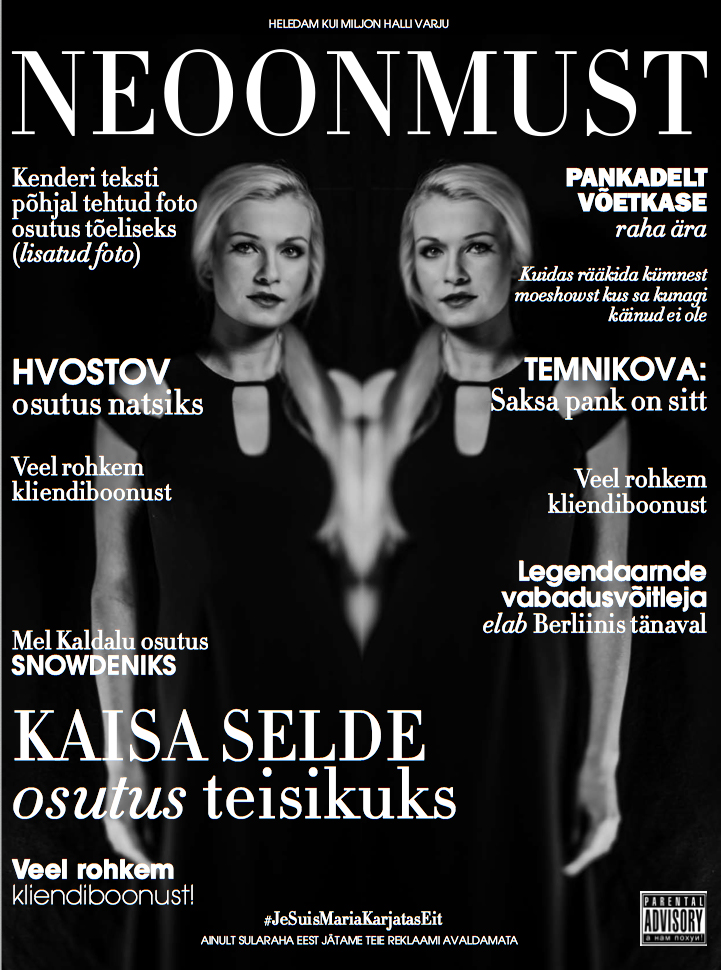 Trendiajakiri Neoonmust tuli selleks, et jääda. Paradoksaalselt 100% öko ja mustvalge uus väljaanne fetišeerib tippglamuuri ja lehetegijad kaebavad, et Eesti seltskonnaajakirjanduses on jäänud piinlikult varju paljud säravad inimesed, kes vääriksid märgatavalt rohkem tähelepanu ja glitter’it.