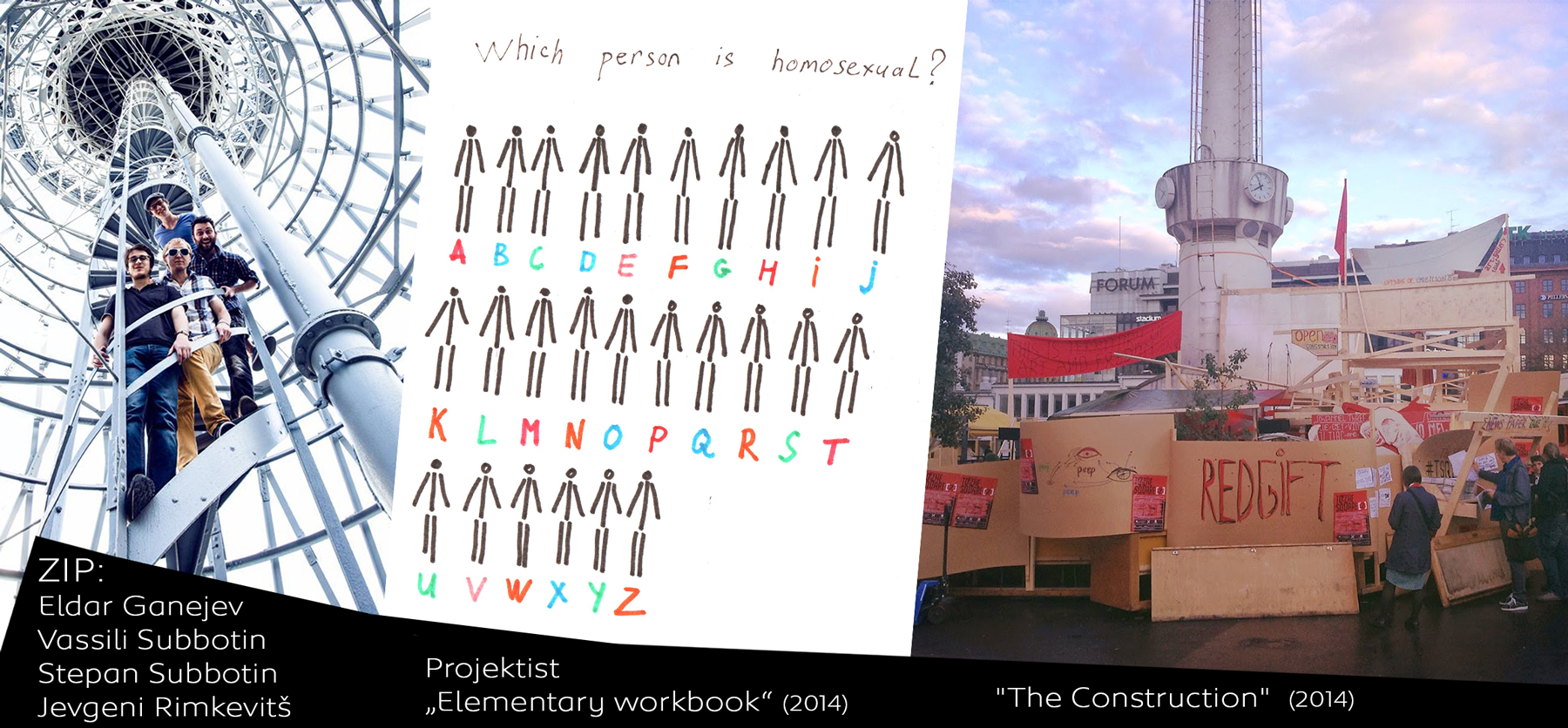Rühmitus ZIP: Kahjuks ei õnnestunud meil avamisele tulla ja fotosid ei ole me veel näinud. Eestis käinud ei ole, kuid me tahame väga kohalikku konteksti uurida. (Krasnodaris tegutsevasse rühmitusse ZIP kuuluvad Eldar Ganejev (s 1977), Jevgeni Rimkevitš (s 1987), Vassili Subbotin (s 1991) ja Stepan Subbotin (s 1987) – toim.)