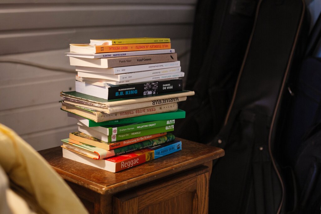 Vahepeal vaatame ülakorrusele magamistuppa, kus kõigepealt haarab silma kogukas öökapikuhi, kus leidub esmapilgul peamiselt värskemat kraami, alates Martin Alguse „Elektrost” ja Riste Sofie Kääri „Apsust” – mis veel lugemist ootavad – kuni Graham Harmani „Neljatise objekti” ja Margus Oti „Heaoluni” (kena lihtne une-eelne lektüür), rääkimata teosest „Reggae. The Rough Guide” (mis, nagu selgub, on kaua lugemisel olnud, eks tema peale toetub ka kogu ülejäänud kuhi), ja muidugi ka värskeim „Tõlkija hääl”.