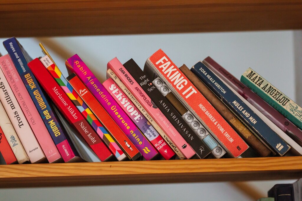 Tundub, et põhjaliku inimesena on Kaisa Müürilehe varasemad „Raamaturiiulid” läbi töötanud ja teab nüüd elutoa soliidse, tervet seina katva riiuli ees seletamispositsiooni sisse võttes üsna hästi, mida ma teada tahan, nii ei pea ma alustuseks eriti midagi küsimagi: üleval paremal on kogumikud ja kõrgemad n-ö formaadiraamatud, edasi tuleb eesti proosa, siis eesti luule, feministlikule lektüürile reserveeritud laudi torkab iseäranis silma, sest „no see on ju roosa”.