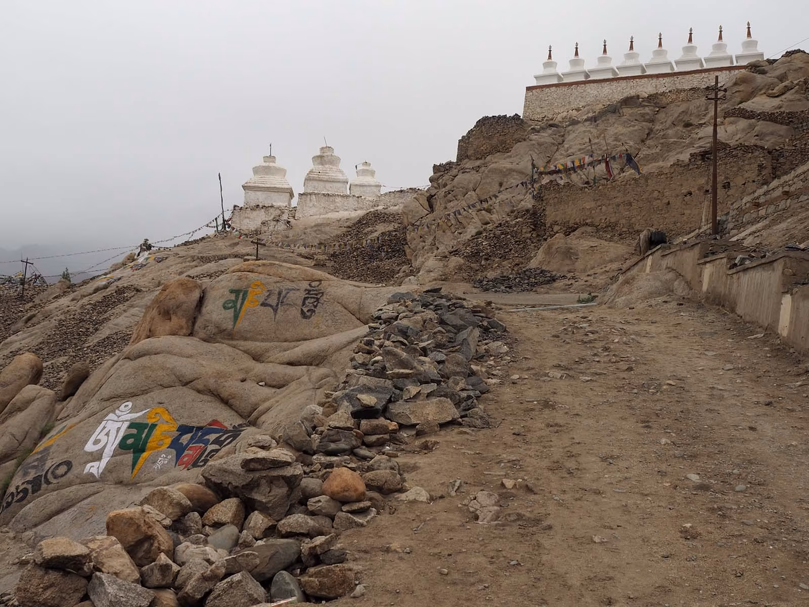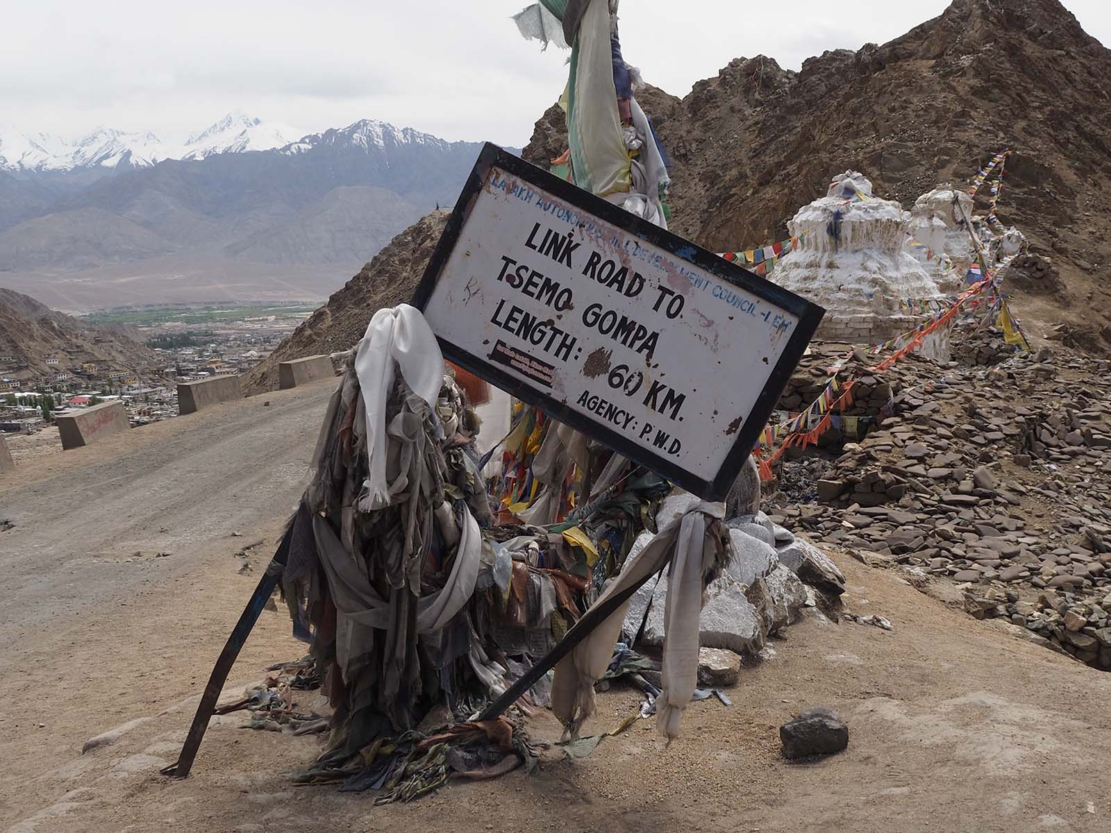 Teeviit Tsemo kloostrisse, mille taga paistavad lubivärviga valgeks võõbatud stuupad.