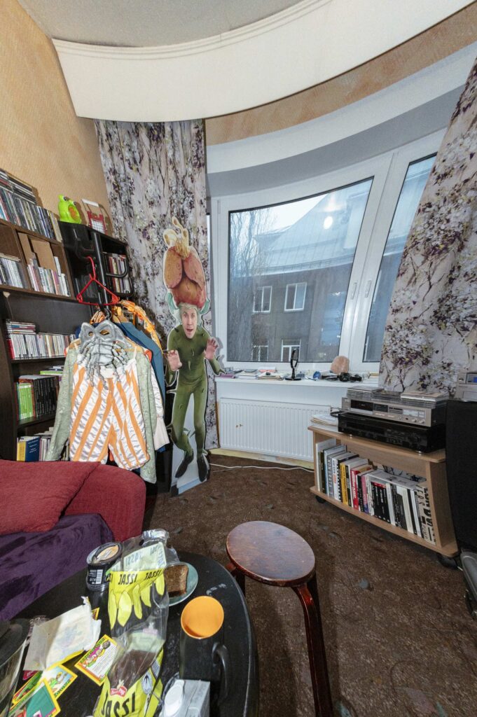 Sarnaselt Jakapi isiksusega on plastiline ka tema kodu. Igal pool püüavad pilku kuhjad. Diivanilaua alla on kogutud seinalt alla langenud plakatid. Need arhiveerivad pea kahe aastakümne jagu esinemisi festivalidel, kontsertidel ja esitlustel. Elutoas ripuvad nagis kostüümid: hall mask, puhvpüksid, sinine hõlst ja oranžid rõngad. Aknalaual on üles rivistatud tualettpeegel, pintsetid, küünetangid ja pliiats kirjaga „Klassikaraadio”. Kuhjas on Lilli Luugi „Kolhoosi miss”, Virginie Despentes’i „King Kongi teooria”, Tove Janssoni „Väikesed trollid ja suur veeuputus”, Paavo Matsini „Gogoli disko” ja Indrek Koffi „Uitmõttepäevik”. Pliidil poti- ja pannikuhi. On plaadikuhjad ja kassetikuhjad. Voodil on neli madratsit, meenutades samuti üleelusuuruses raamatuhunnikut. Kuigi üldmulje on kaootiline, on iga asi omal kohal. Kuulen, et see on mitmes mõttes legendaarne korter. Siin on elanud põnevaid inimesi, toimunud pidusid ja majutatud terveid bändikollektiive.