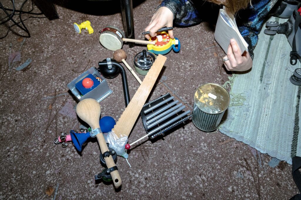 Nõristame tassidesse viimased kohvipiisad. Hommikusöök on lõppenud ja oleme tunnistajaks söögilaua stuudioks muutumisele! Vilunud liigutusega haarab Roomet toanurgast hõbedase kohvri ja tõstab selle demonstratiivselt lauale. Sealt ilmuvad lauale rätik ja kaks mikrofoni. Seejärel looper’id ja muud efektimasinad. Kasutada eelistab Roomet vanakooli „rauakola”, mis on küll kogukas, aga lollikindel. Akustilised instrumendid on nii helide tekitamiseks kui ka etendusliku olukorra loomiseks. Lauale pudenevad plastmassist äratuskell, puidust saag, mõned isekombineeritud instrumendid pasunatest ja rattakelladest.