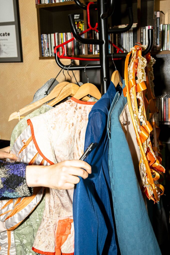 Lameskulptuuri kõrval on… „Kostüümiladu in progress. Need on kõik Vanemuise kostüümilaost ostetud.” Jakapi ülesastumistega käib sageli kaasas mänguline välimus. Kui küsin kostüümieeskujude kohta, pistab Roomet mulle pihku raamatu David Bowiest ja näitab pilte Peter Gabrielist, kes on ilmunud lavale nahkhiire ja samuti lillena! Kostüümidega kaasnevaid karaktereid Jakapil pole. Iga esinemisega sünnib lavakuju uuesti.