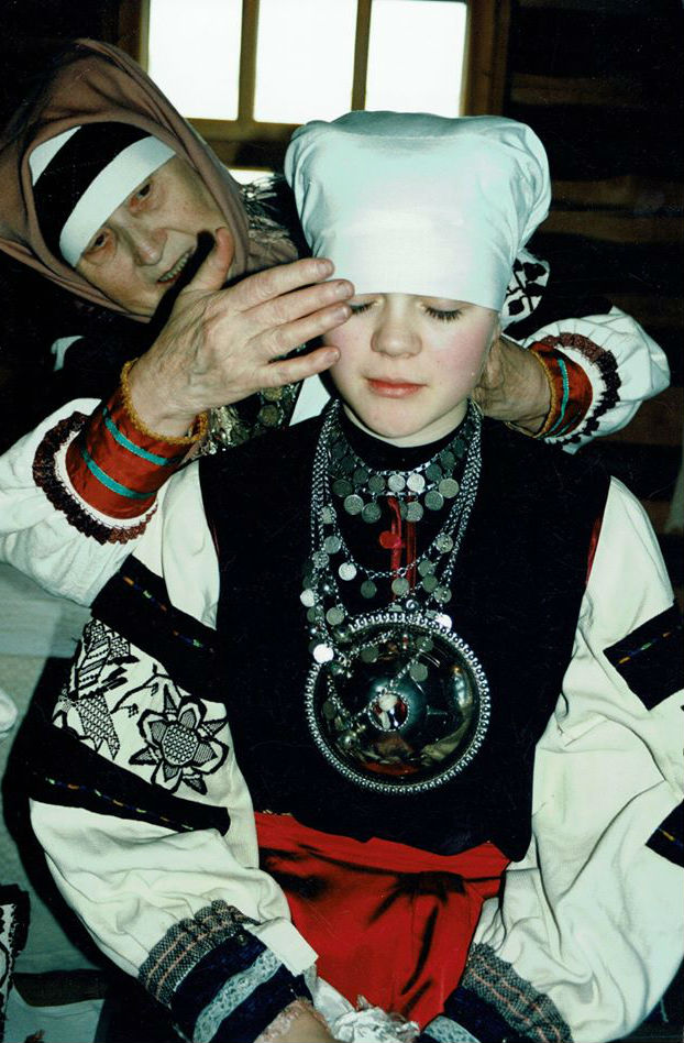Seto pulmas pandi neiule linik pähe ja sellega sai neiust abielunaine, kes ei tohtinud enam linikuta üle toagi kõndida. Jane Tuik ja Maria Rõžikova seto pulma lavastuses, 2001. aastal. Foto Tiiu Kunst