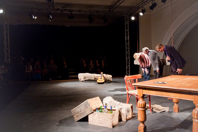 Treppidest üles ronides jõuab lõpuks hämarasse ärklisaali, kus tamiili otsas kõikuvate vanade raamatute vahel avaneb tõeline ideeteater. Ruum on minimalistlik ja väljapeetud. Avamisel peetakse kolm kõnet. Mulle meeldib kõige rohkem Õnnepalu oma. Tema mõistab selle veidi maagiliselt prõksuva ja samas üleva ruumiga kõige paremini suhestuda, nii et ümbrus vait jääb. Isegi vanad teatrikriitikud, kes läbematult ruumi taganurgas häälekalt klaasidesse valget veini soristarvad, ei häiri.