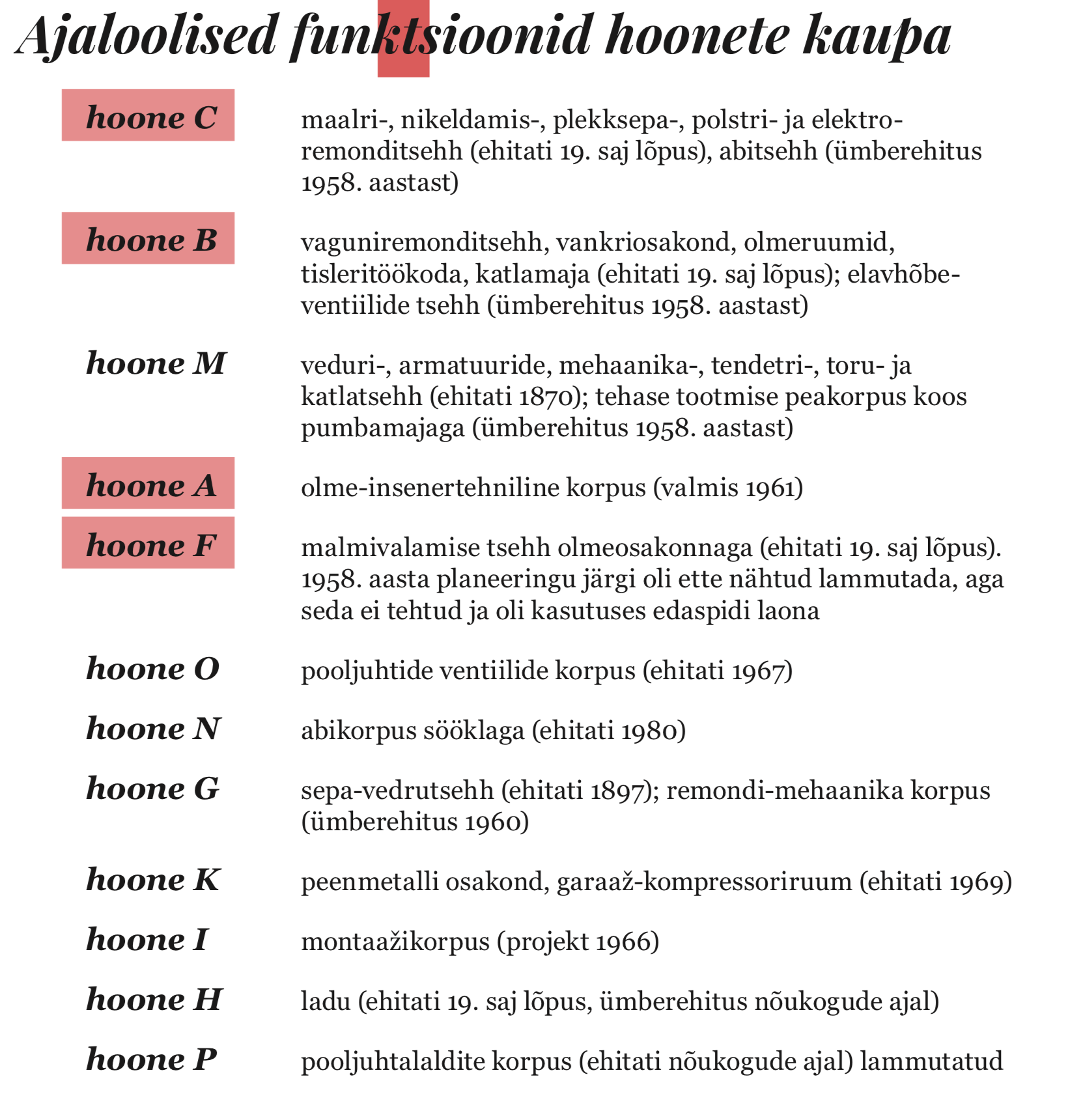 Materjalide defitsiidi, inseneride diktaadi, krundi kitsikuse ja poliitilise surve tingimustes sündisid tehase ajalooliste hoonete veduri- (hoone M) ja vagunitsehhi (hoone B) ümberehitused peakorpuseks ja elavhõbeventiilide tsehhiks. Eriti ilmekas on vana raudtee peatehaseaegse paekivihoone sulatamine kokku modernismiga elavhõbeventiilide tsehhi näitel. Vana paehoone moderniseeris arhitekt Juta Kruusimäe paeseinte maksimaalseks aknapindadeks lõigates, hoone tõmmati kokku teise korruse klaasfassaadi ažuurse pika lindiga. Hoone otstesse tekkinud silikaattellistest fassaadidega põikmahudest üks evib suisa 1930. aastate telgsümmeetriat ja illusoorsete lintakende esteetikat.