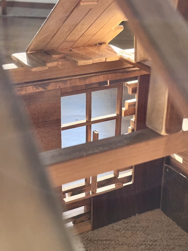 Olen EKA lõputööde festivali TASE ‘22 raames Chun Au Yeungi installatsioonide teises asukohas, tema kodus Soo tänaval. Ainult tänavalt sisse põigata ja mööda kitsast treppi üles ronida ning pea näengi enda ees kunstnikku, kes juhatab mind alguses läbi ühe, siis läbi teise toa. Euroopas kasutab ta Chun Au asemel nimekuju Junny, mis tundub paljudele suupärasem. Ühte tuppa langeb soe päevavalgus, mis näitab mulle kätte minimõõtudes puidutükkidest hoolikalt valmistatud lõpetamata majakese; seda ümbritsevatest mööbliesemetest ongi needsamad jupid välja saetud. Kitsa laua peal on kirjutusmasin. Nurgas seisab tuhast tühjaks tehtud ahi. Pisimajakese ülesehitus baseerub selle toa plaanil, kus me parasjagu viibime. Seinu ääristab paari kämbla laiune vaibaraam, mille keskelt on lõigatud välja osa, mis katab nüüd EKA installatsiooni põrandat. Kuid mitte täielikult – sellest on omakorda lõigatud välja majakese põrandaplaani suurune tükk, mis ongi nüüd selle sisse paigutatud.