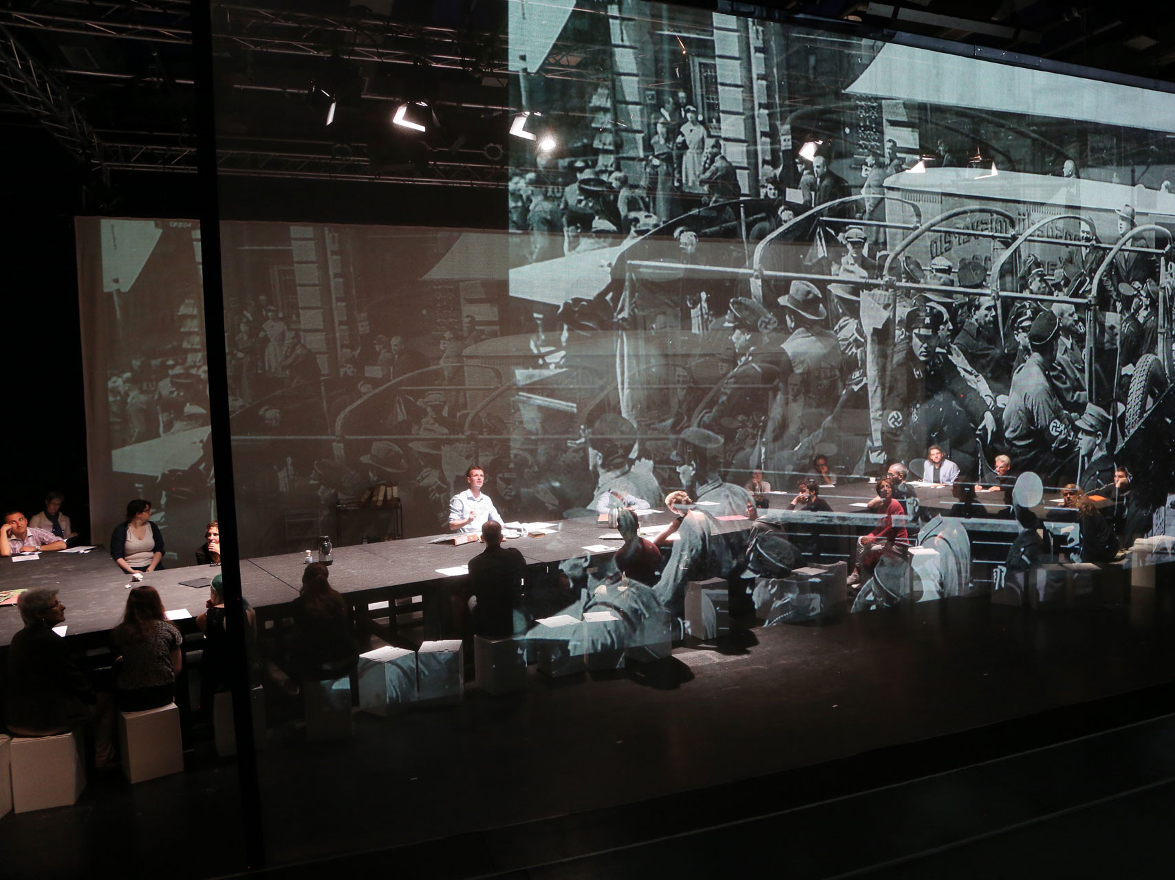 Selleks rekonstrueerisid lavastaja Hans-Werner Kroesinger ja dramaturg Regine Dura, kes on kaks olulisemat vabakutselist dokumentaalteatri tegijat Saksamaal, Karlsruhe Riigiteatri originaaldokumendid. Aktid, ajaleheartiklid, mälestused, intervjuud tunnistajatega mängitakse laval veel kord läbi. Vaatajad, kes istuvad samuti suure töölaua taga, saavad teada, kuidas Karlsruhes juudi näitlejad, üks juudi suflöör ja intendant lahti lasti, vahistati, eksiili saadeti või enesetapuni viidi.